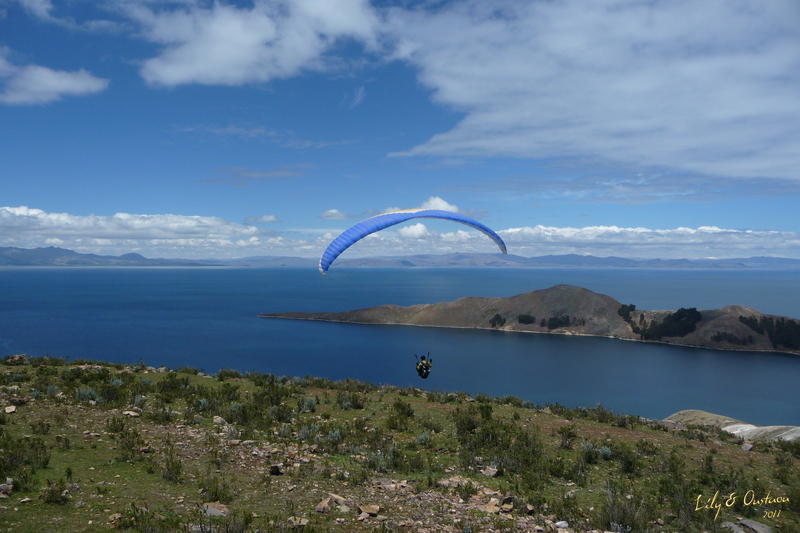 Nous passons ensuite la frontière, quittons le Pérou un peu déçus par le tourisme de masse qu'il y règne et par le manque de vols en parapente, et entrons en Bolivie par Copacabana. Petite ville située au bord du lac, son principal attrait touristique réside là aussi dans une île du Titicaca, la Isla del sol. Copacabana ne présente en effet rien de particulièrement intéressant, mis à part sa basilique, ses habitants y passent leurs journées à bénir des voitures et à boire de l'alcool assis sur des cageots au milieu des rues. L'ambiance y est exceptionnellement calme le soir après 22 heures, car la majorité des locaux (hommes ou femmes) ayant commencé à boire depuis la fin de la matinée, ils sont complètement bourrés en fin d'après-midi et vont se coucher tôt ! Nous ne sommes cependant pas venus pour goûter les gnôles locales, mais plutôt pour nous dégourdir les ailes...