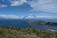 C'est pourquoi, un début d'après-midi, nous grimpons à pied les 400 mètres de dénivelé jusqu'au sommet d'une colline surplombant la ville, où sont dressées quelques antennes à 4200 mètres d'altitude. Nous patientons un moment au sommet le temps que le vent faiblisse un peu, et profitons d'une vue superbe sur le Titicaca. Mais au sud, un cumulo-nimbus (nuage d'orage particulièrement dangereux pour les drôles d'oiseaux que nous sommes) grossit et commence à se rapprocher de nous, et nous pousse à ne pas tarder à décoller. On vole une quinzaine de minutes, dans un bon dynamique et même quelques thermiques, tout en s'extasiant de voler au-dessus du mythique Titicaca ! Ce vol restera un de nos plus beaux, bien qu'il fut abrégé par la menace du cumulo-nimbus, et nous nous posons sur la plage sous l'œil à demi-éveillé des boliviens.