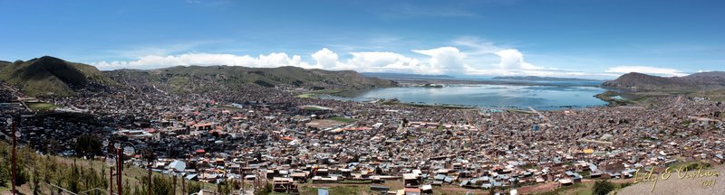 Après quelques jours, nous quittons Cusco et son climat pluvieux pour monter sur l'Altiplano, à une altitude moyenne de 3812 mètres, au bord du lac Titicaca. Plus haut lac navigable du monde, il est aussi le plus long lac d'Amérique du Sud avec environ 204 km entre les deux extrémités. Il est traversé de part en part par la frontière entre la Bolivie et le Pérou, 56% du lac appartenant au Pérou et 44% à la Bolivie.