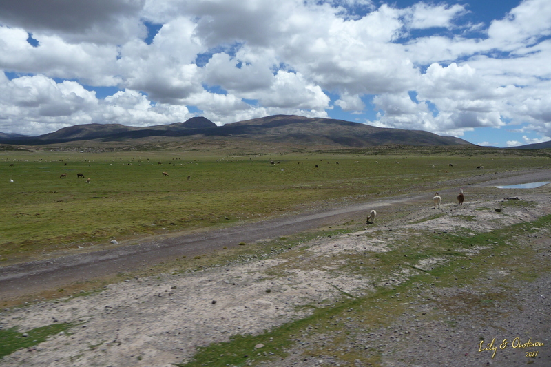 L'avantage de cette mésaventure est que nous pouvons profiter des magnifiques paysages de l'altiplano de jour, vu que nous n'avons pu avancer que de quelques kilomètres durant la nuit. Nous traversons alors d'immenses étendues de steppe surplombées de majestueux volcans, où broutent des troupeaux de centaines de lamas... une véritable image de carte postale !