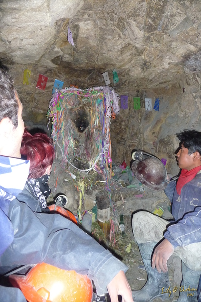 Puis on monte enfin au Cerro Rico, et on s'engage dans la mine del Rosario. On parcourt une grande distance dans un tunnel étroit, la plupart du temps pliés en deux, avant de s'engager plus profondément dans la montagne et de descendre dans des niveaux inférieurs. Depuis le temps que la mine est exploitée, il faut maintenant aller jusqu'au cœur de la montagne pour trouver des petits filons encore exploitables. Aujourd'hui, l'argent ne fait plus le bonheur mais ce sont essentiellement l'étain et le zinc qui sont extraits. Arrivés dans une petite cavité, on rencontre Don Julio, mineur de 43 ans qui travaille dans la mine depuis plus de 35 ans... Il paraît beaucoup plus vieux, et nous explique qu'il a sept enfants dont il refuse qu'ils viennent travailler dans la mine. Il dit lui-même que cette mine n'a plus d'avenir, et rêve d'envoyer ses enfants étudier en Argentine. On le laisse ensuite travailler, assis tout seul dans le noir et la poussière à trier des échantillons de roches à l'aide de son marteau et de sa petite lampe, et on continue de s'enfoncer dans cet enfer. On y rencontre donc logiquement un diable, appelé le tio Jorge. Sous l'apparence du diable, cette statue d'argile représente en fait la divinité locale, le propriétaire de la montagne et du minerai qui protège les mineurs et leur permet de découvrir de nouveaux filons à condition de lui laisser quelques offrandes. Plus loin, on rencontre plusieurs groupes de mineurs dont certains évacuent l'eau des dernières pluies, tandis que d'autres ouvrent de nouvelles galeries à l'aide de dynamite et évacuent les gravats par des wagonnets !