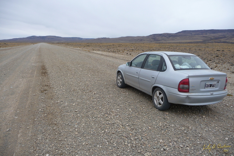 Nous reprenons ensuite la Ruta 3 pour la Réserve de Punta Tombo, qui abrite la plus grande colonie de "pinguinos" de Magellan du continent avec plus d'un million d'individus. Bien que leur période de nidification soit terminée et que les pingouins débutent alors leur migration vers des eaux plus froides, nous espérons tout de même pouvoir observer quelques retardataires pas encore partis vers leurs quartiers d'hiver. Nous quittons donc à nouveaux la Ruta 3 en direction de l'océan pour une centaine de kilomètres de "ripio". Loin d'être la pire portion de piste que notre véhicule a subit depuis le début du périple, ce sera pourtant celui qui aura sa peau puisque les cailloux bondissant auront raison de la pompe à carburant située sous la voiture, dans la seule zone non-renforcée du dessous-de-caisse de notre Corsa... Et là, bien qu'on n'y connait rien en mécanique, une seule évidence : la voiture ne bougera pas de si tôt, et nous sommes au milieu de nulle part ! La dernière estancia croisée est à plusieurs dizaines de kilomètres et la nuit commence à tomber, tant pis pour les pinguinos il nous faudra passer la nuit là et attendre le lever du jour pour partir chercher de l'aide.